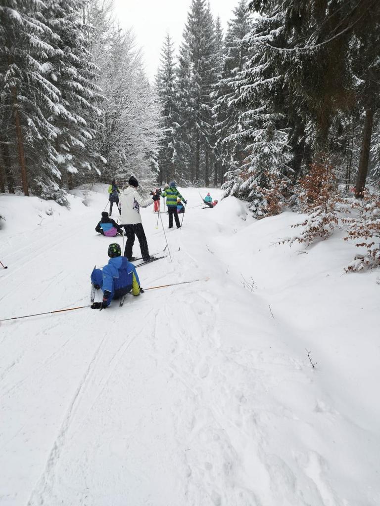 Na čtvrtek hlásil model předpovědi počasí dopoledne déšť a tak došlo na odpočinek, společenské hry a aktivity na penzionu. Po obědě, kdy bylo znatelné, že žáci jsou plní energie, jsme se vydali do předem připravené závodní trasy, kterou připravil pan ředitel a kde si žáci vylosovaní do družstev změřili síly na běžkách. Podle profilu tratě se očekávalo mírné drama při výšlapech v kopcích, či sjezdech a následných odšlapech do zatáček. Závod se uskutečnil a na závěr žáci zářili štěstím, že mají závod za sebou. I přes množství originálních pádů do měkké sněhové peřiny, byli usměvaví. Povzbuzování a vzájemné podpora táhla všechny vpřed a do cíle.