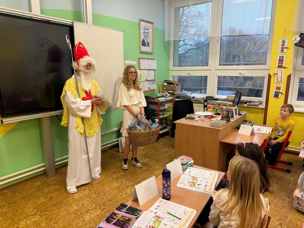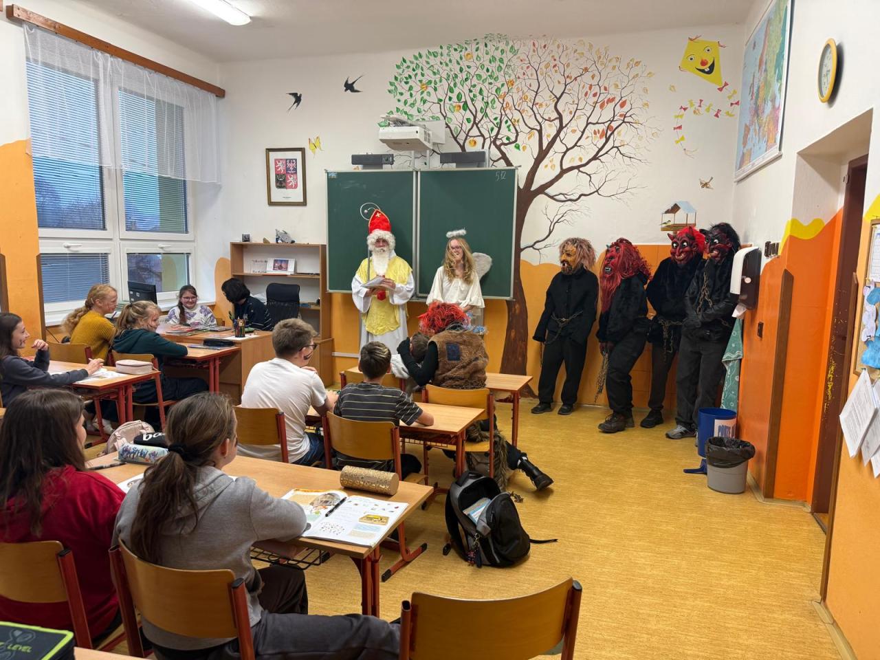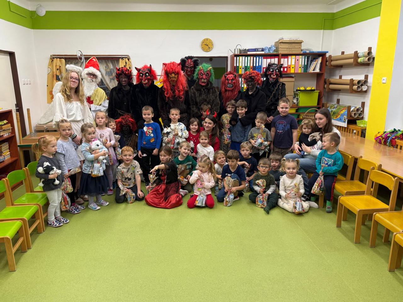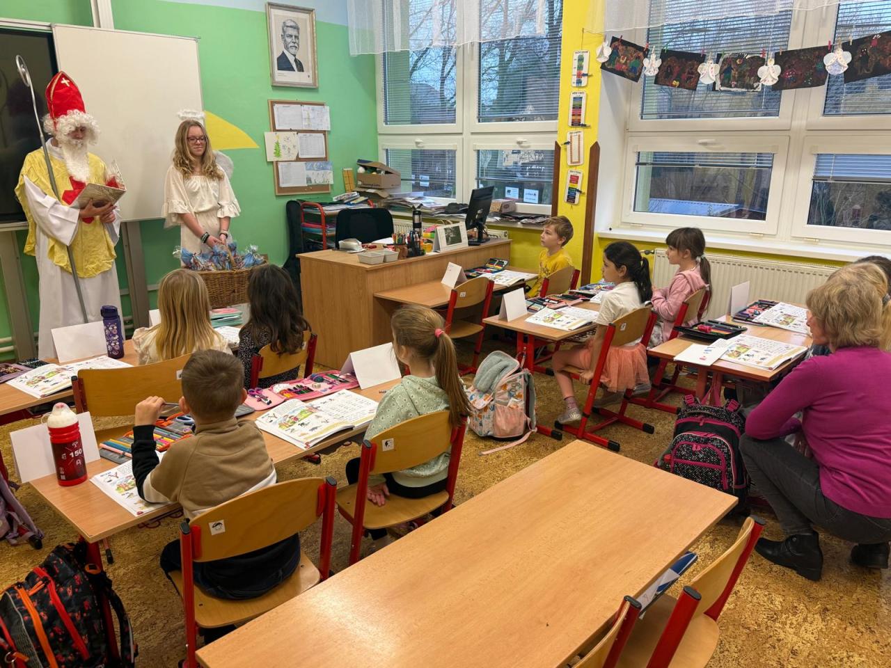Do tříd zavítal nejen laskavý Mikuláš, ale také jeho doprovod - čerti s andělem. V ruce měli samozřejmě i knihu hříchů, do které se během roku zapsalo nejedno neposedné chování či drobné školní nepravosti. Čert občas významně zahučel, anděl zase každého chlácholil a Mikuláš s úsměvem rozhodoval, kdo si zaslouží pochvalu a komu připomenout, že je čas polepšit se.