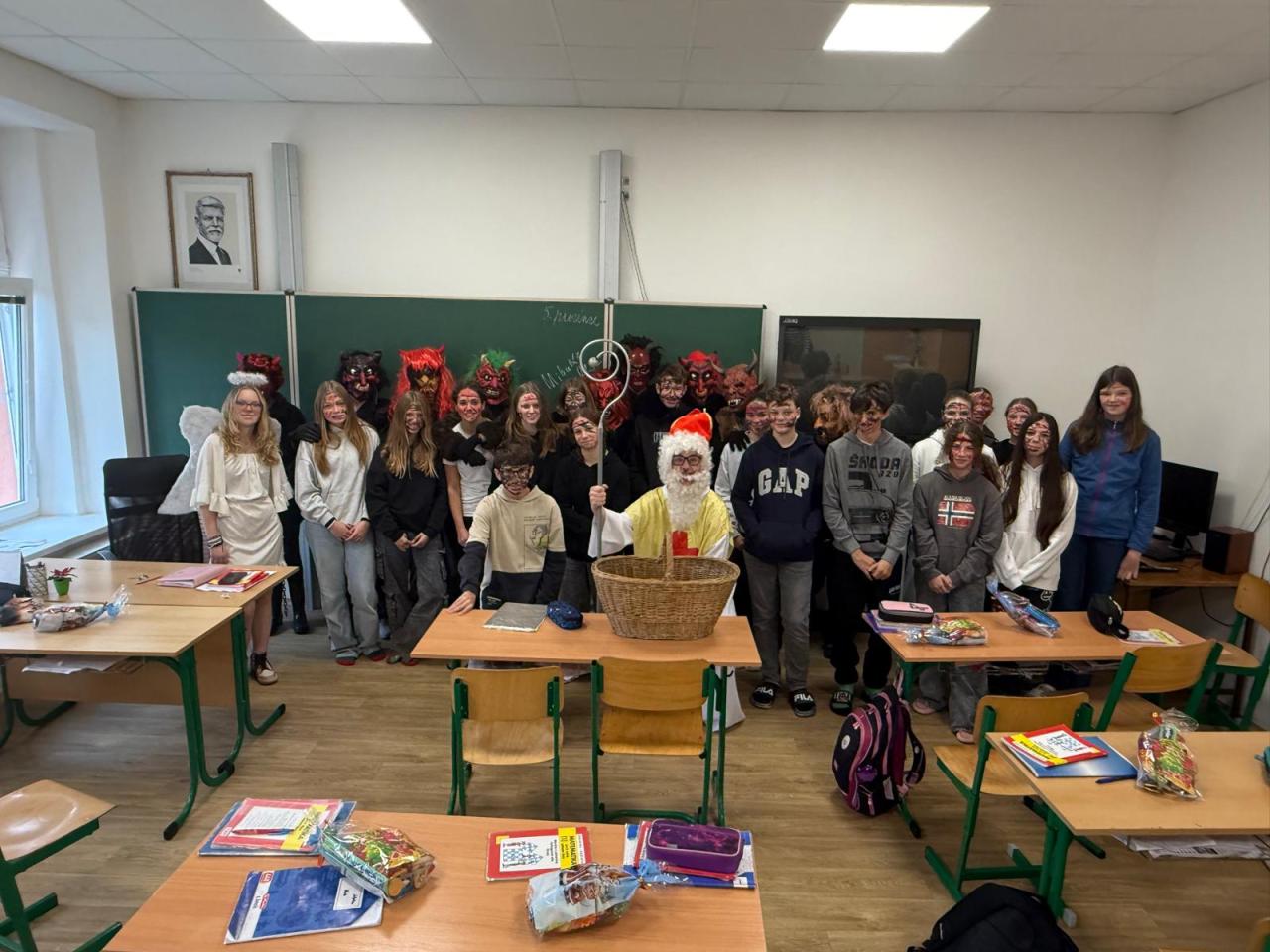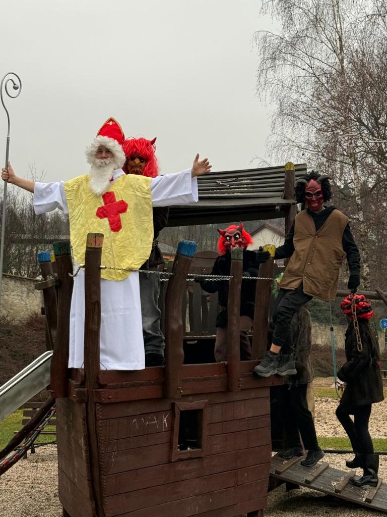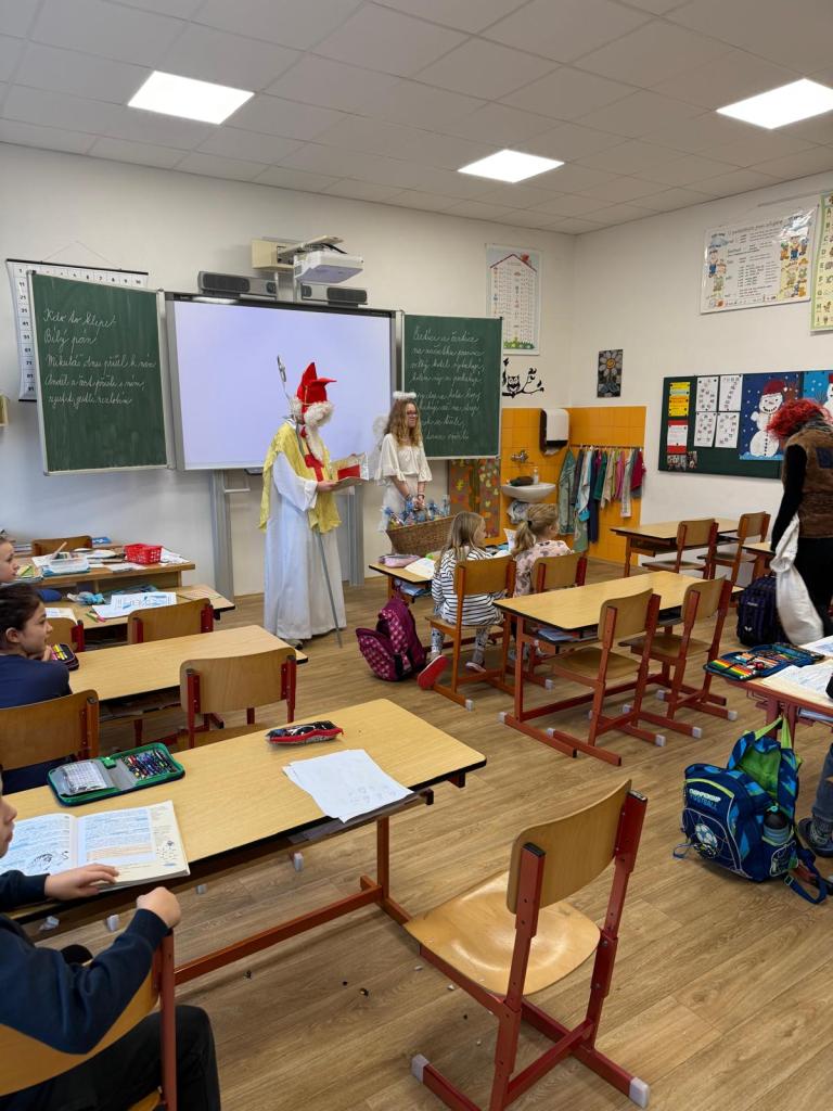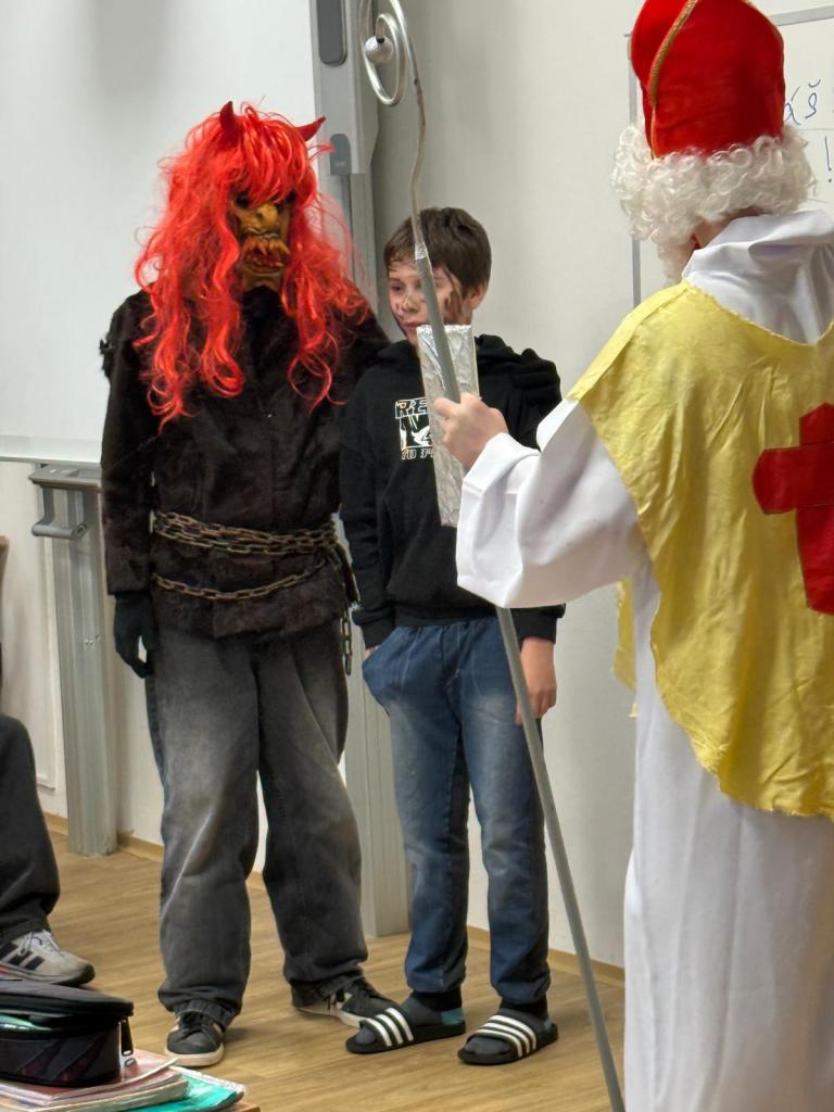Dnešní den se ve škole nesl v duchu mikulášské nadílky. Už od rána panovala veselá a nezbedná atmosféra – po chodbách se ozýval smích, napjaté špitání i zvědavé očekávání. A když se konečně objevil Mikuláš se svou družinou, bylo jasné, že dnešní den bude ve škole o zábavu postaráno.