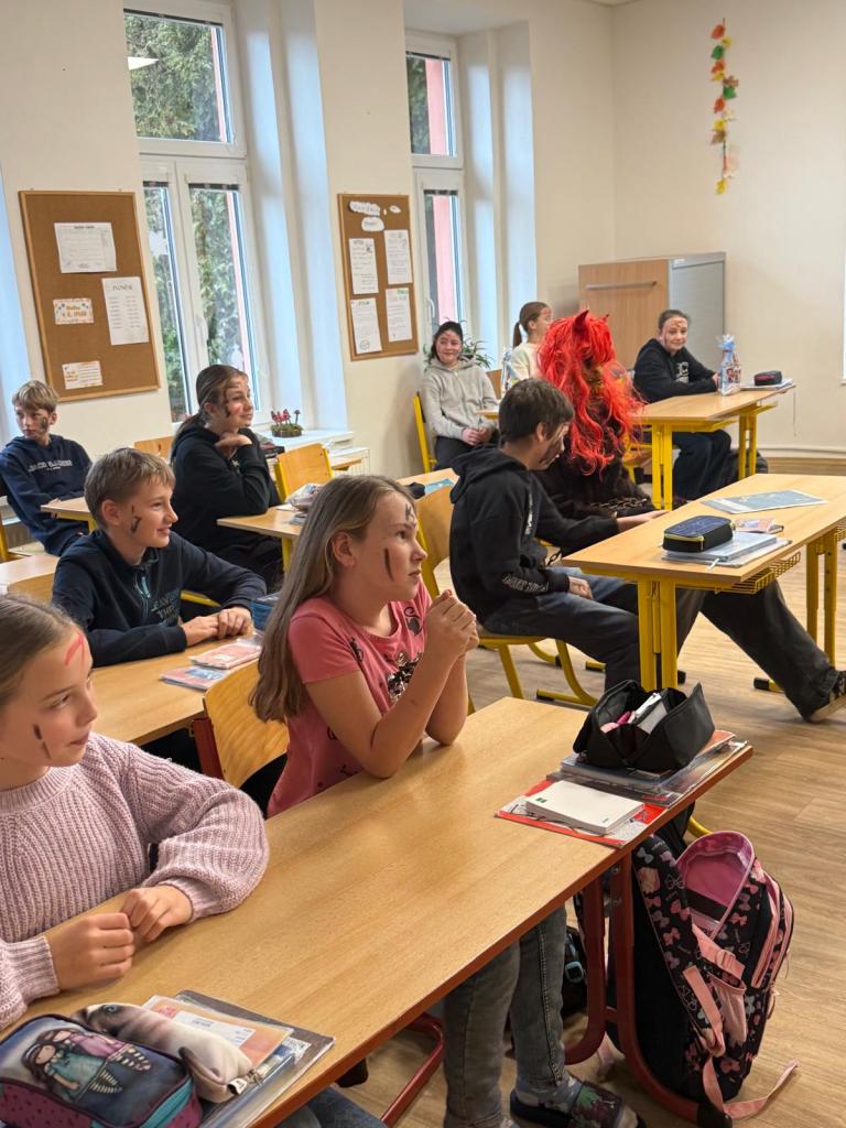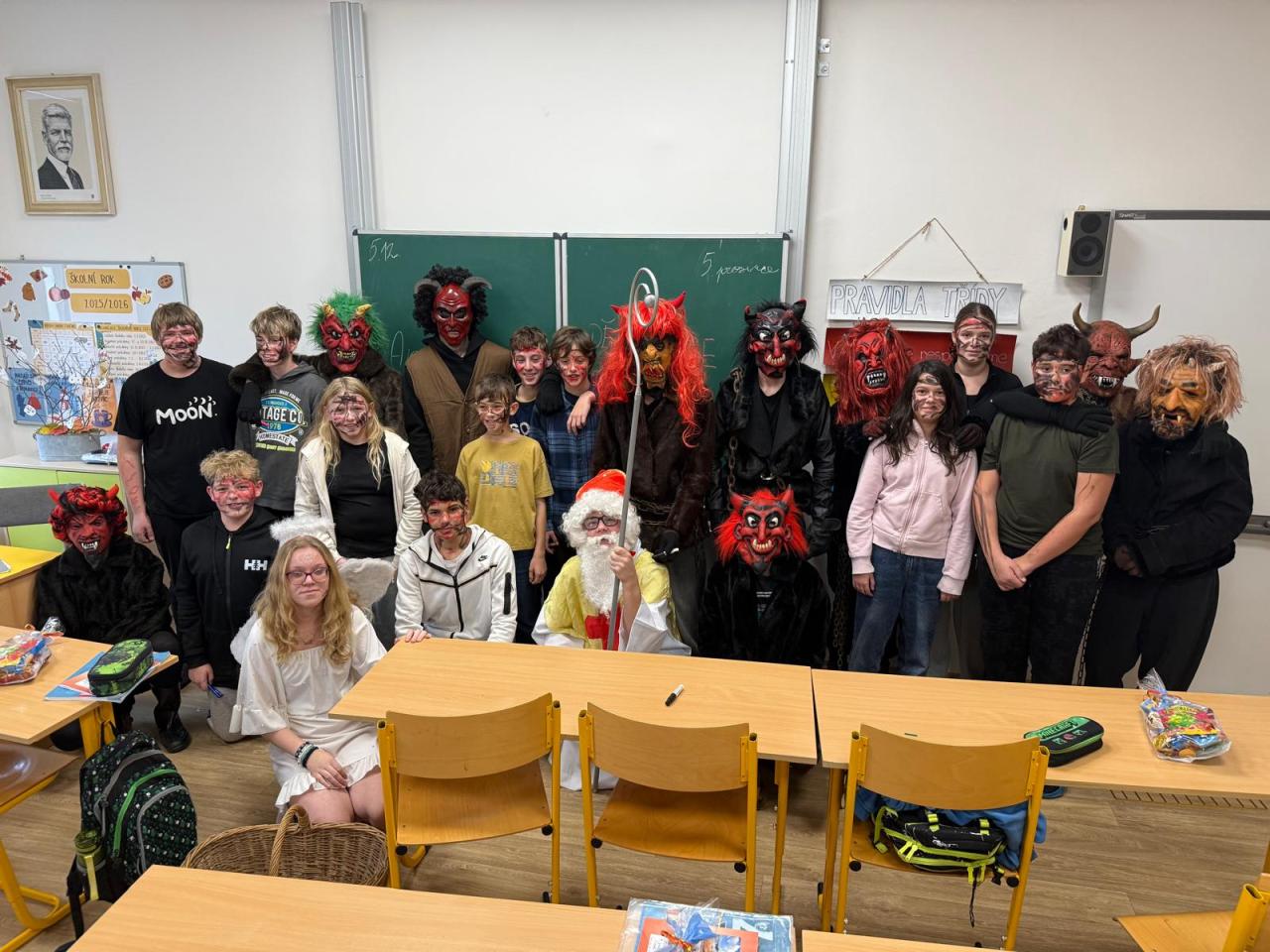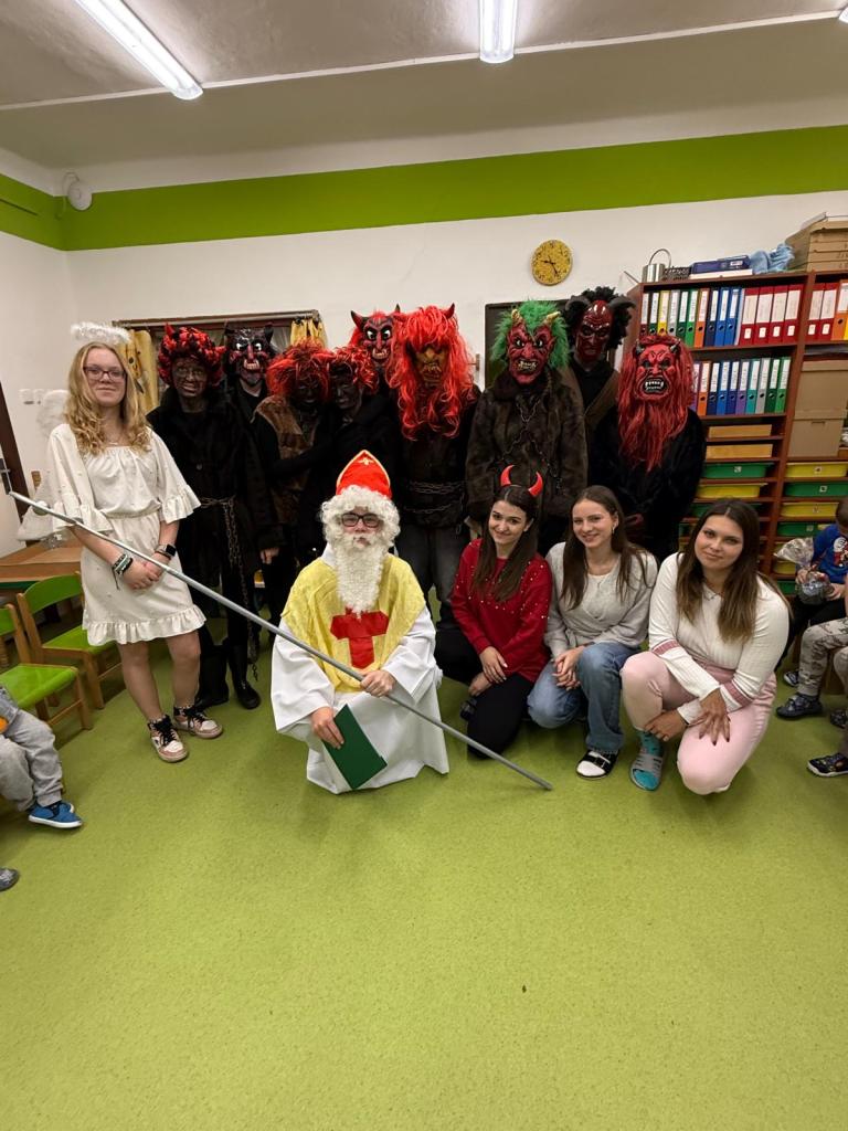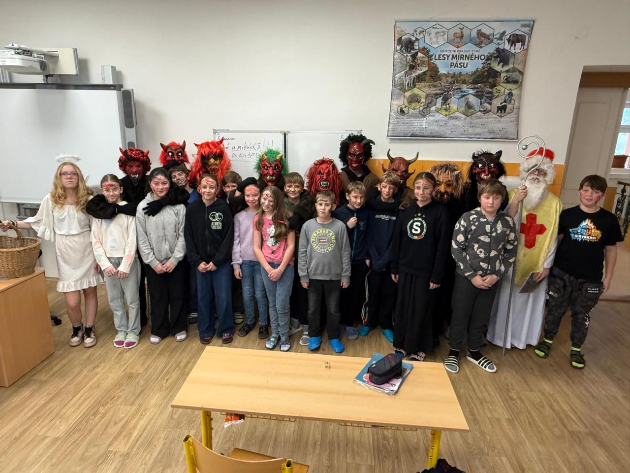 Dnešní den se ve škole nesl v duchu mikulášské nadílky. Už od rána panovala veselá a nezbedná atmosféra – po chodbách se ozýval smích, napjaté špitání i zvědavé očekávání. A když se konečně objevil Mikuláš se svou družinou, bylo jasné, že dnešní den bude ve škole o zábavu postaráno.